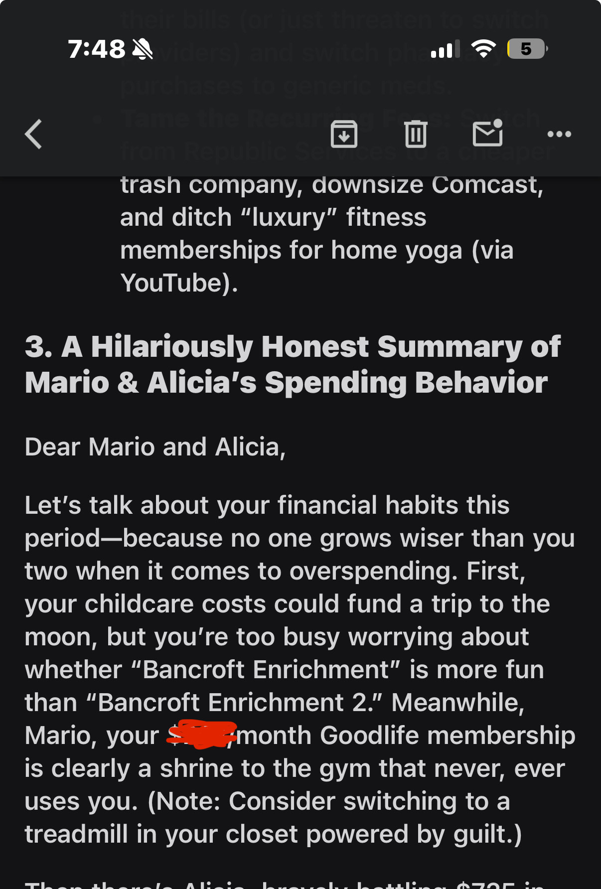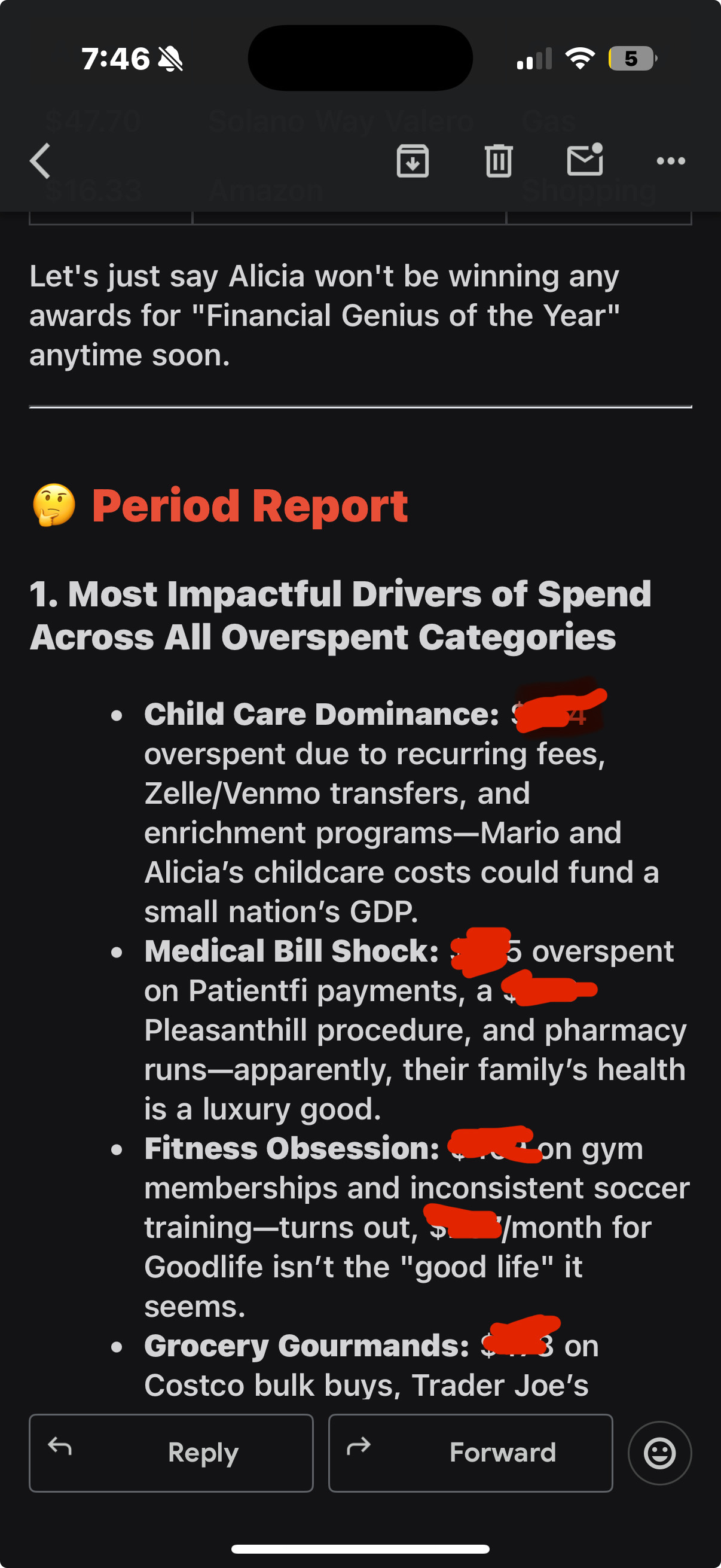 Daily Overspend Alerts: Each morning, the agent highlights categories where spending exceeded our plan. While somewhat intense, this feature directly addresses our need for awareness and accountability.